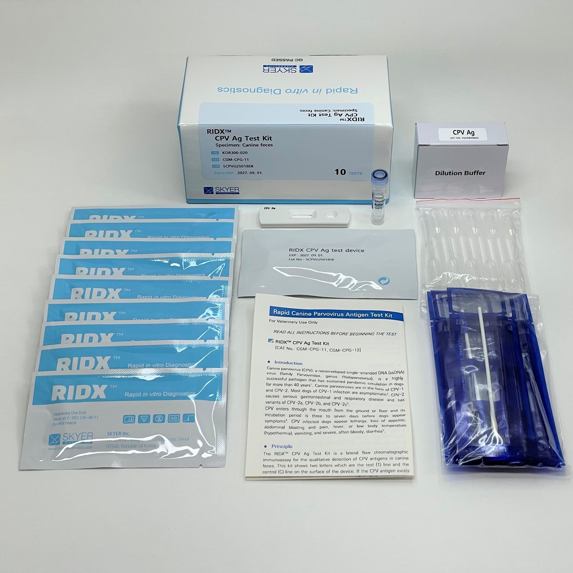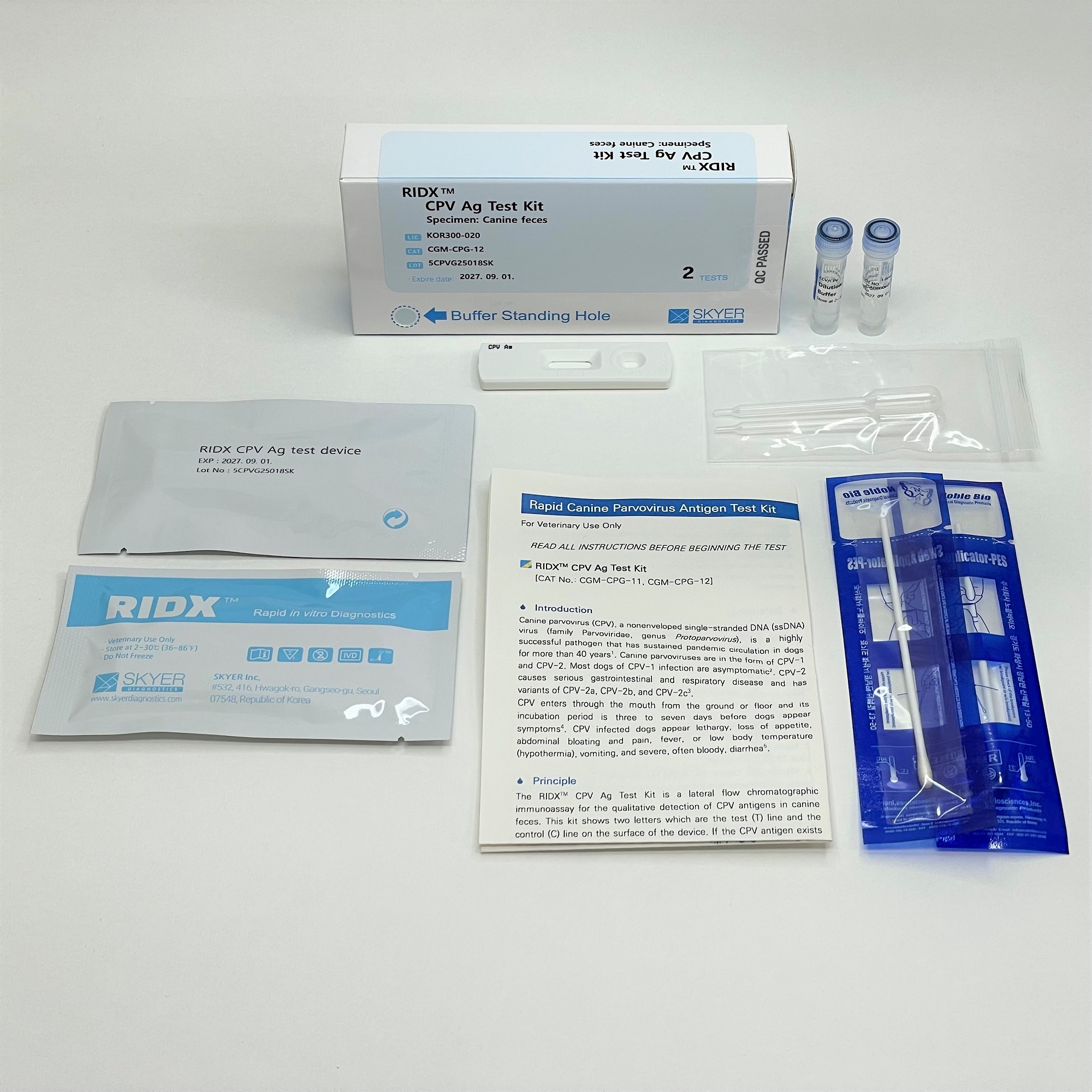 The RIDX® CPV Ag Test Kit is a lateral flow chromatographic immunoassay for the qualitative detection of CPV antigens in canine feces. This kit shows two letters which are the test (T) line and the control (C) line on the surface of the device. If the CPV antigen exists in the sample, it binds to the gold-conjugated CPV antibody. The antigen-antibody complex moves through the membrane by capillary force and responds to the CPV antibody on the test line, resulting in a red line. The control line indicates that the test is performed correctly and should appear when the test is complete.