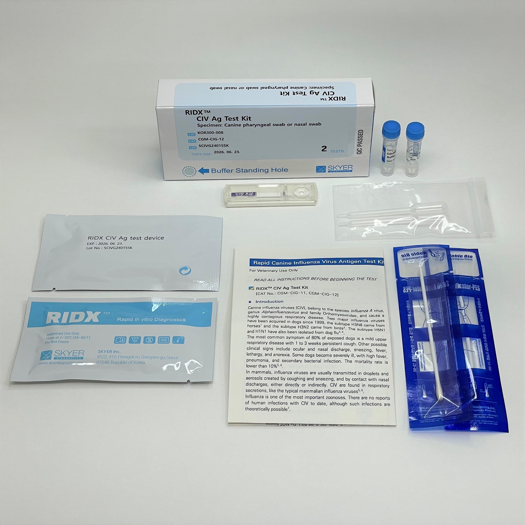 The RIDX® CIV Ag Test Kit is a lateral flow chromatographic immunoassay for the qualitative detection of canine influenza virus antigens in canine pharyngeal or nasal secretions. This kit shows two letters which are the test (T) line and the control (C) line on the surface of the device. If the CIV antigen exists in the sample, it binds to the cellulose nanobeads (CNB)-conjugated CIV antibody. The antigen-antibody complex moves through the membrane by capillary force and responds to the CIV antibody on the test line, resulting in a red line. The control line indicates that the test is performed correctly and should appear when the test is complete.