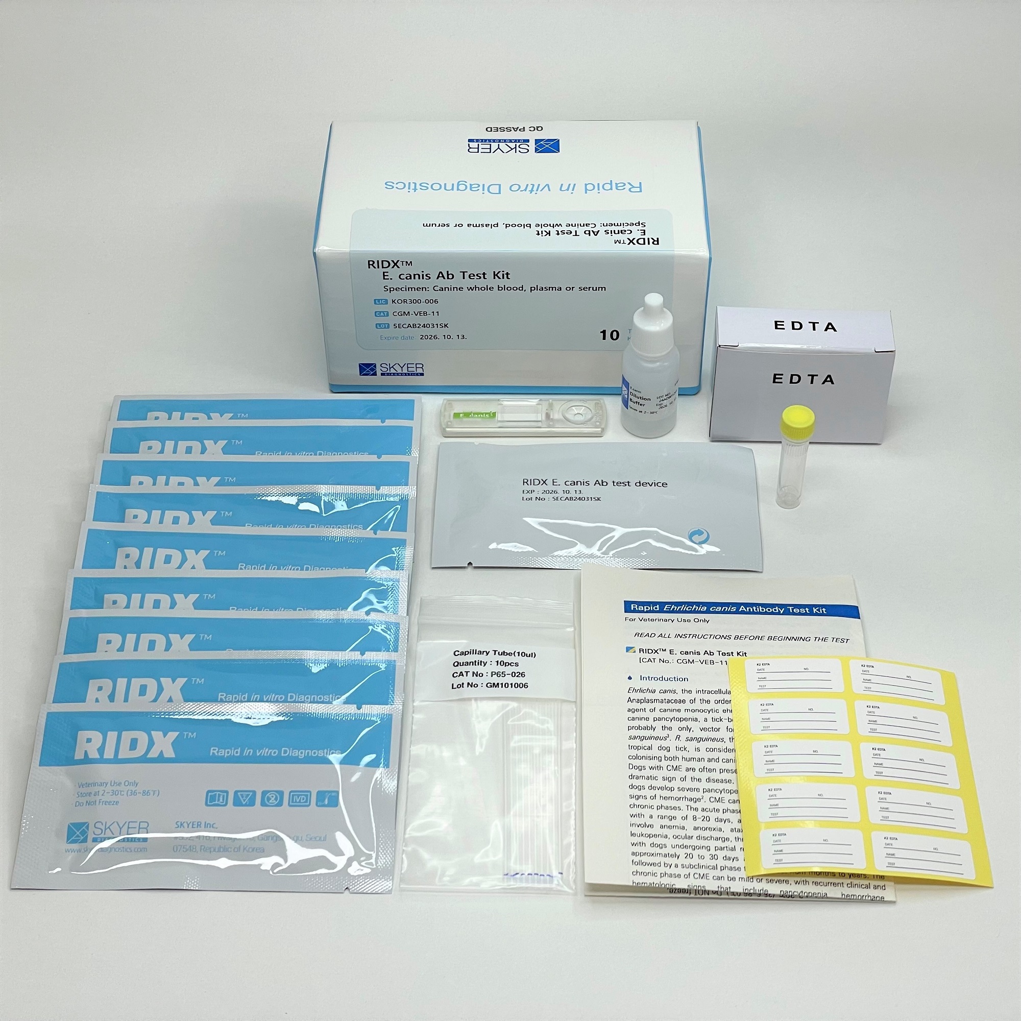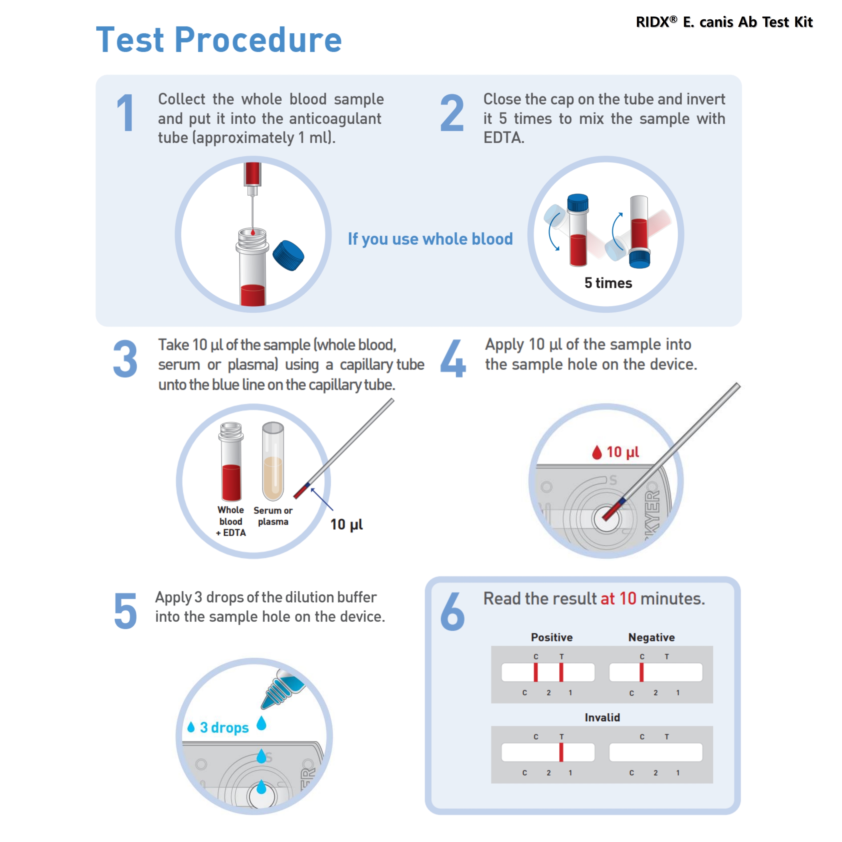 The RIDX® E. canis Ab Test Kit is a lateral flow chromatographic immunoassay for the qualitative detection of E. canis antibodies in canine blood. This kit shows two letters which are the test (T) line and the control (C) line on the surface of the device. If the E. canis antibody exists in the sample, it binds to the gold-conjugated anti-canine IgG. The complex moves through the membrane by capillary force and responds to the recombinant E. canis antigen on the test line, resulting in a red line. The control line indicates that the test is performed correctly and should appear when the test is complete.