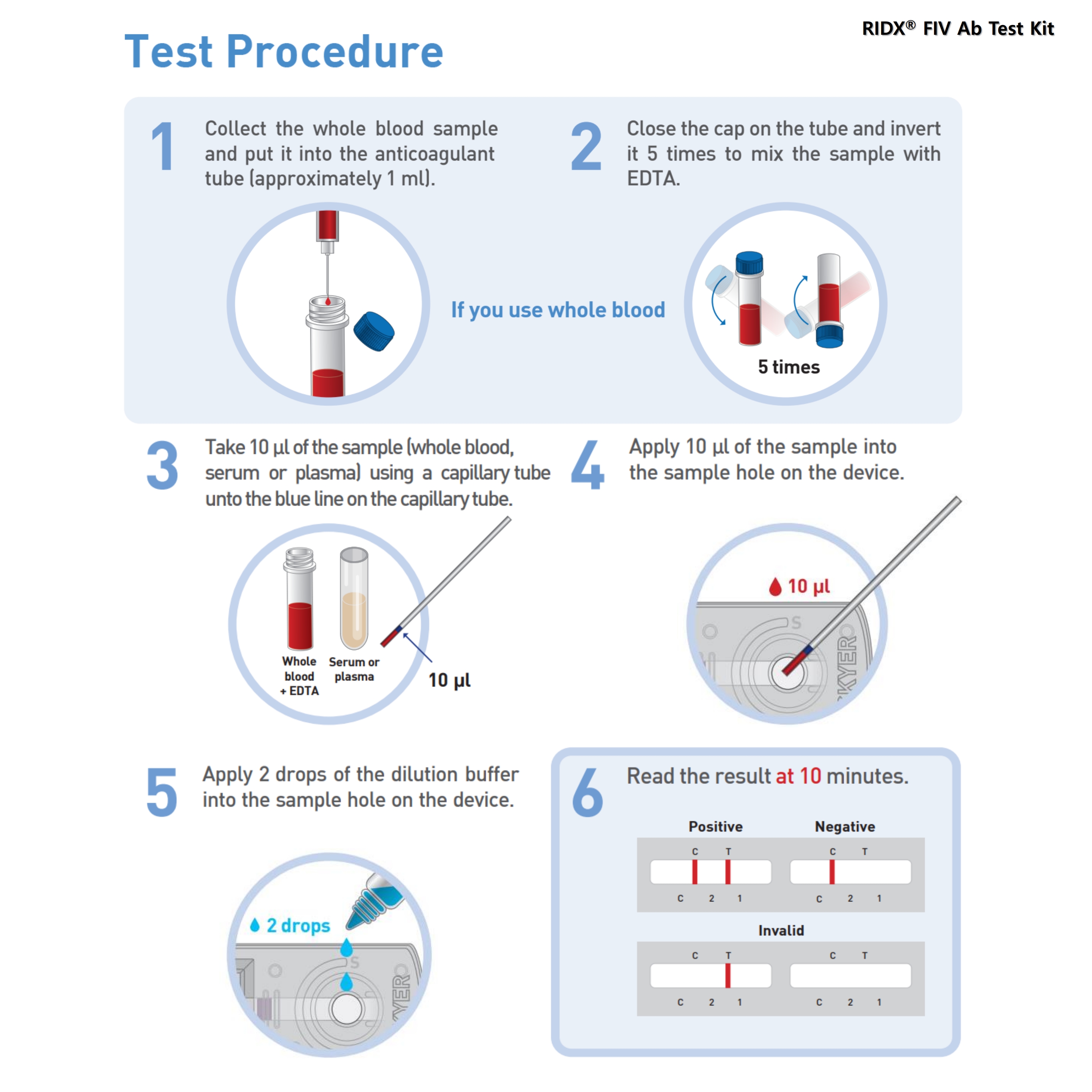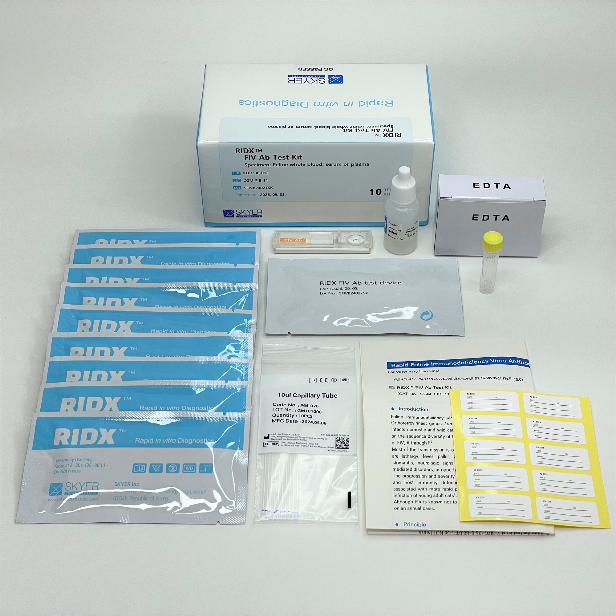 Feline immunodeficiency virus (FIV) decreases the function of the immune system of cats. FIV-infected cats are susceptible to other types of infections that can affect other parts of the body, including the mouth, gastrointestinal tract, urethra, and skin. They also increased the risk of developing blood cancer. The RIDX® FIV Ab Test Kit is a lateral flow chromatographic immunoassay for the qualitative detection of FIV antibodies in feline blood. This kit shows two letters which are the test (T) line and the control (C) line on the surface of the device. If the FIV antibody exists in the sample, it binds to the gold-conjugated protein A. The antibody-protein A complex moves through the membrane by capillary force and responds to the FIV antigen on the test line, resulting in a red line. The control line indicates that the test is performed correctly and should appear when the test is complete. The high-quality recombinant FIV antigen (p24) is used as capture in the kit. RIDX® FIV Ab Test Kit can detect FIV antibodies in feline blood with high accuracy.