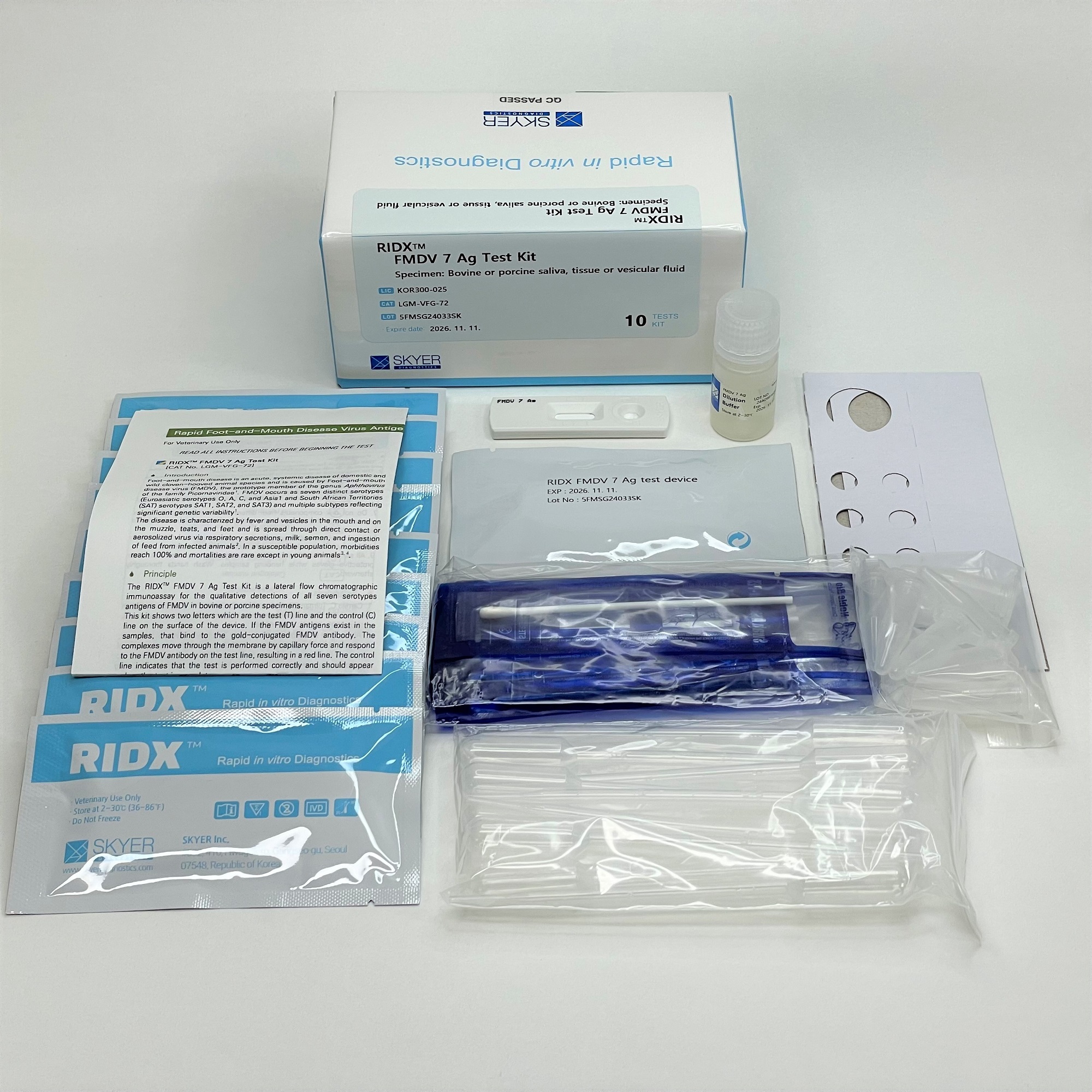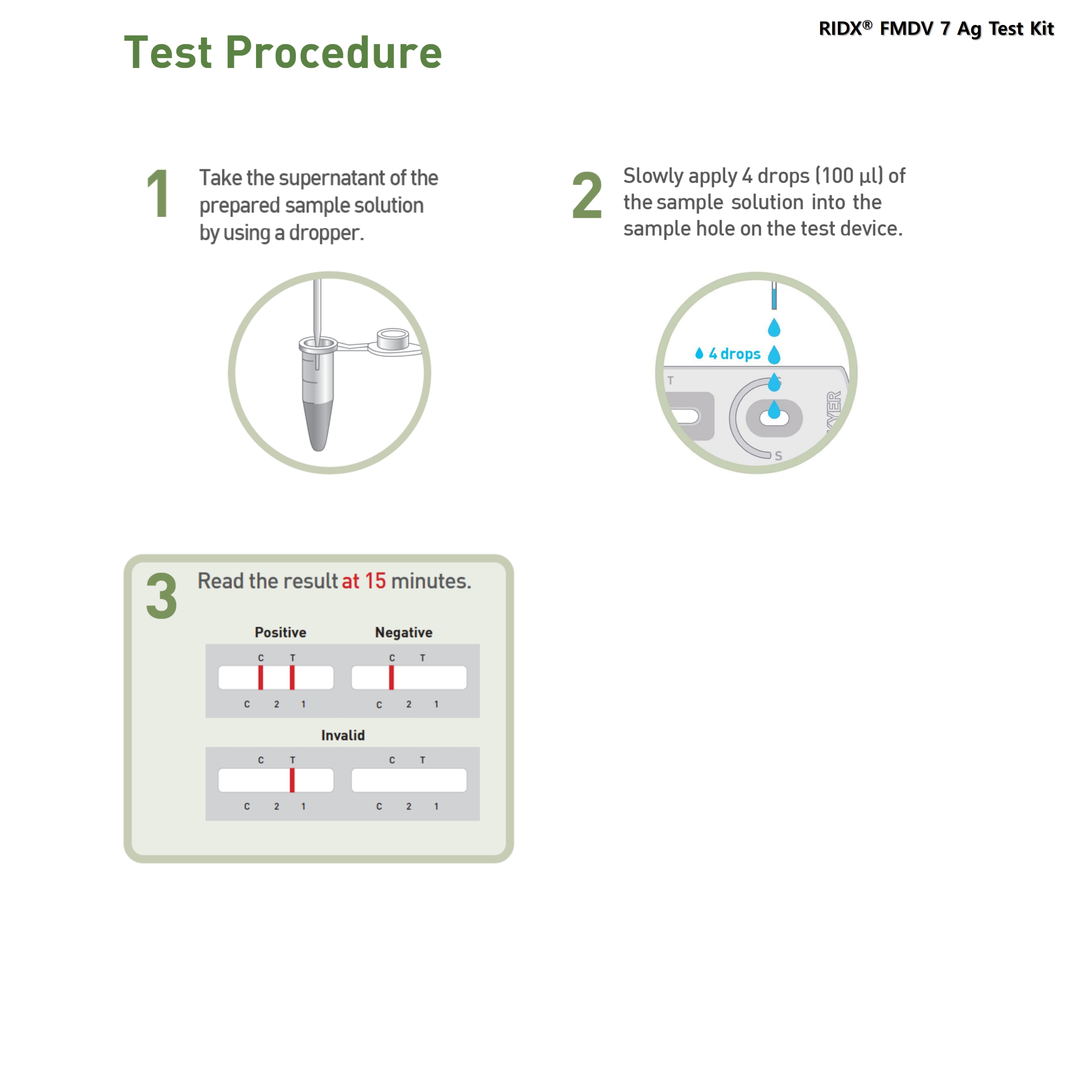 The RIDX® FMDV 7 Ag Test Kit is a lateral flow chromatographic immunoassay for the qualitative detections of all seven (7) serotypes of FMDV antigens in bovine or porcine specimens.