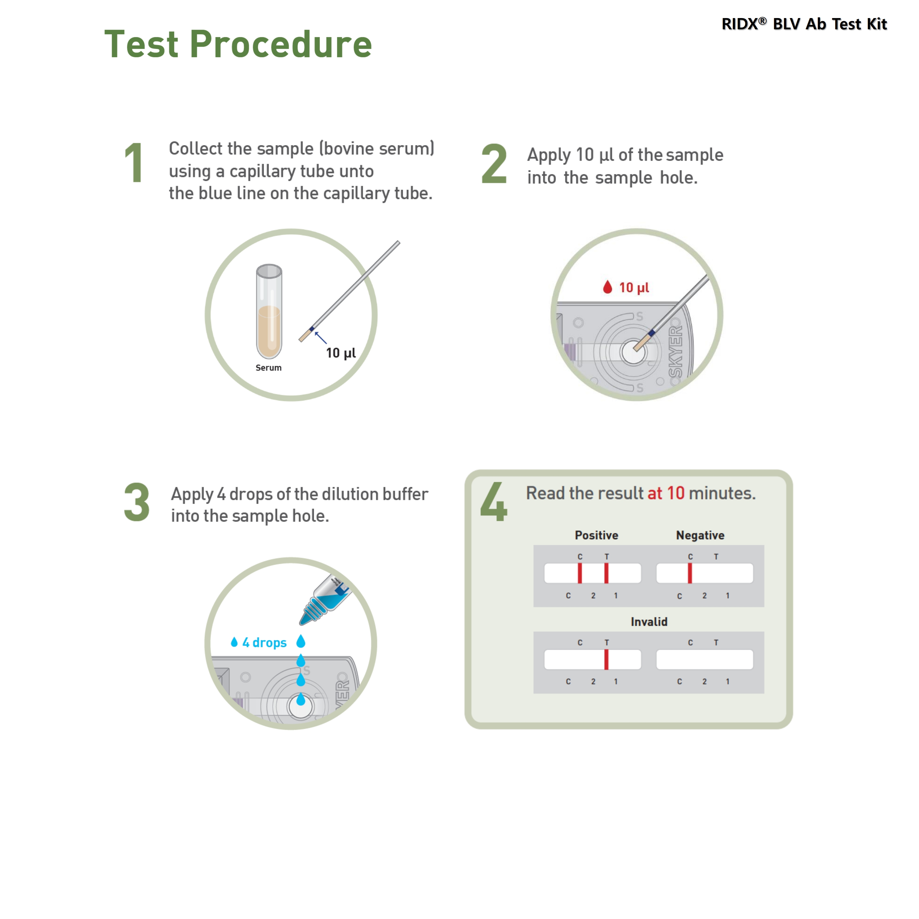 The RIDX® BLV Ab Test Kit is a lateral flow chromatographic immunoassay for the qualitative detection of bovine leukemia virus antibodies in bovine serum. This kit shows two letters which are the test (T) line and the control (C) line on the surface of the device. If the BLV antibody exists in the sample, it binds to the gold-conjugated BLV antigen. The antibody-antigen complex moves through the membrane by capillary force and responds to the BLV antigen on the test line, resulting in a red line. The control line indicates that the test is performed correctly and should appear when the test is complete.