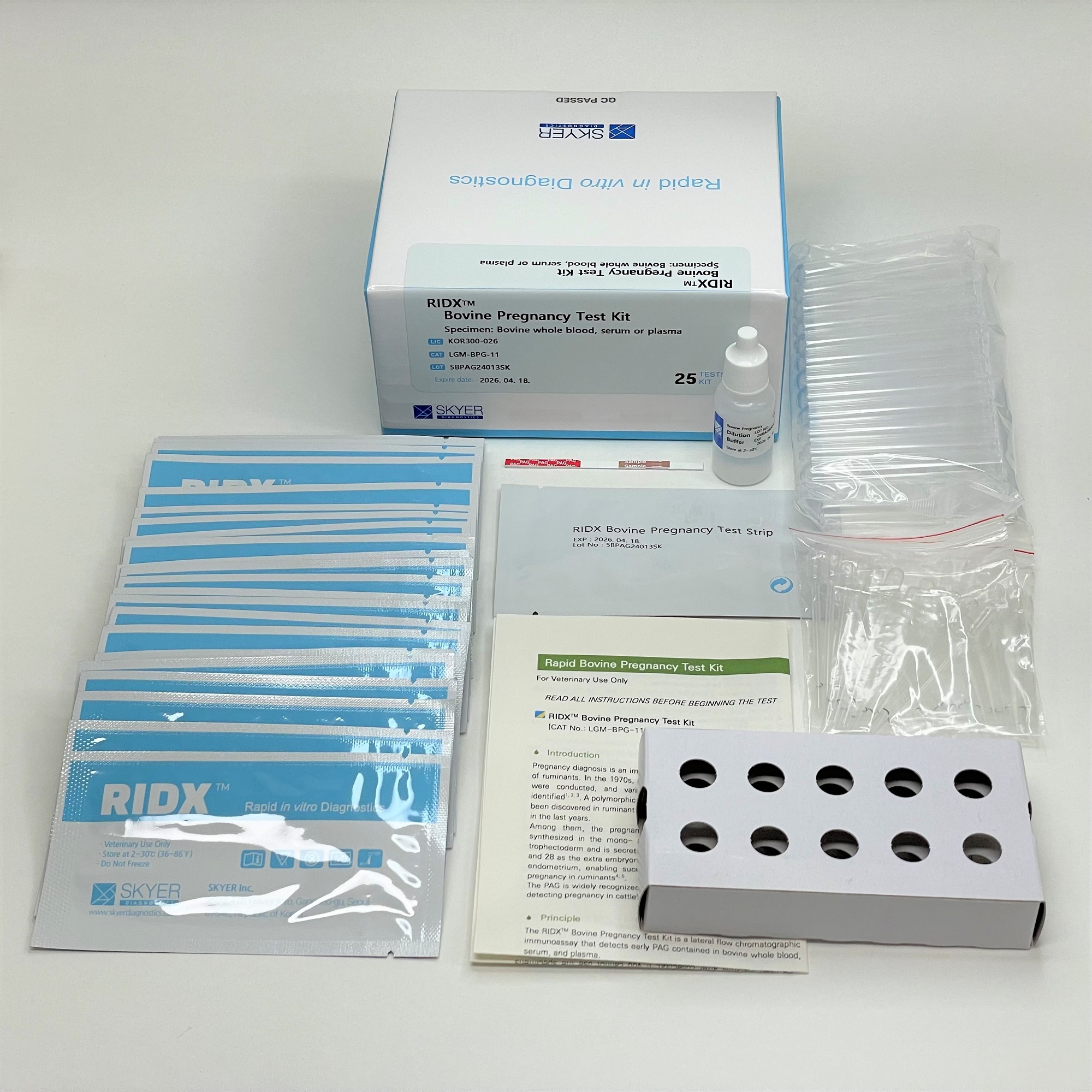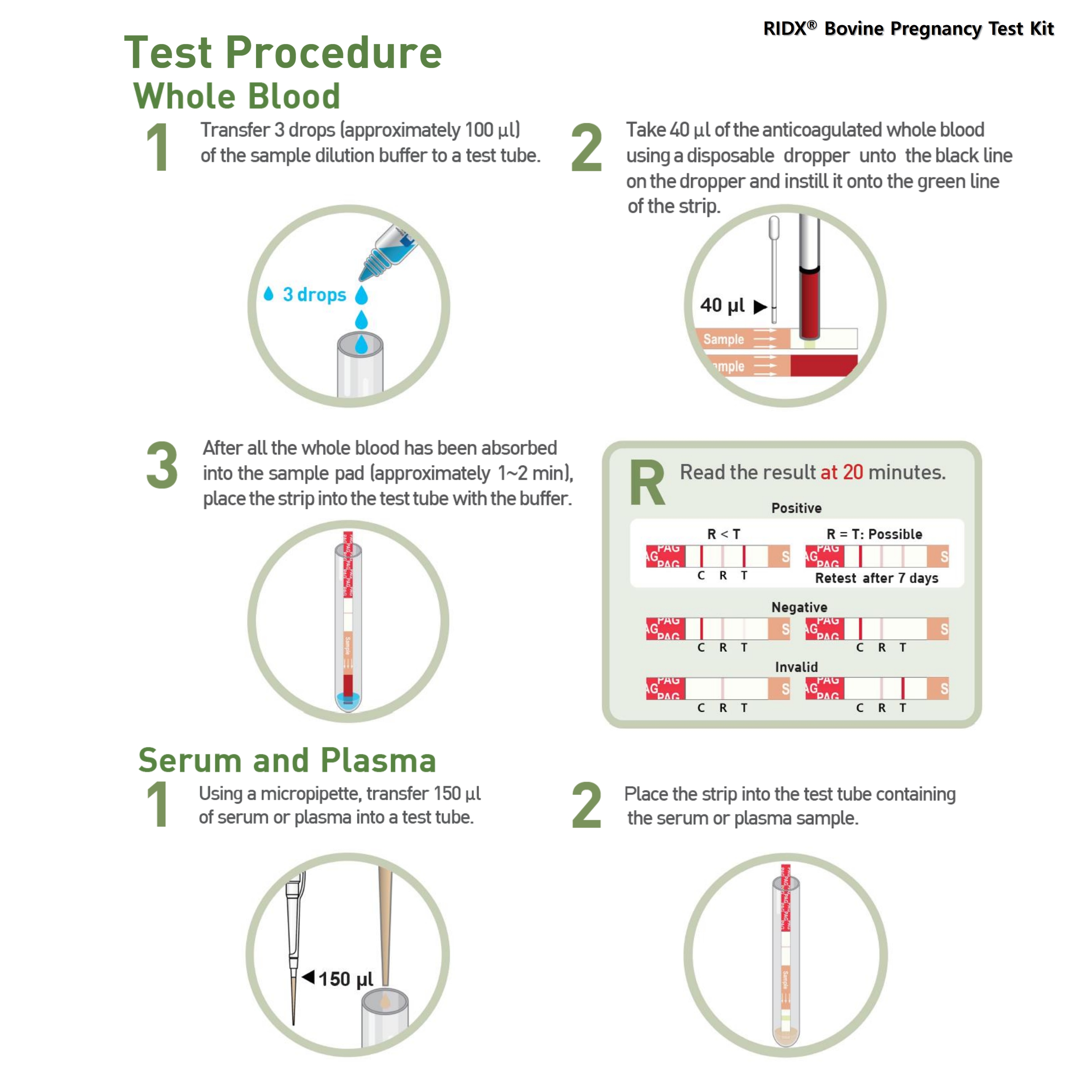 The RIDX® Bovine Pregnancy Test Kit is a lateral flow chromatographic immunoassay that detects early PAGs (Pregnancy-Associated Glycoproteins) contained in bovine whole blood, serum, and plasma. Since 1970s, the PAG is widely recognized as one of the most efficient markers for detecting pregnancy in cattle.