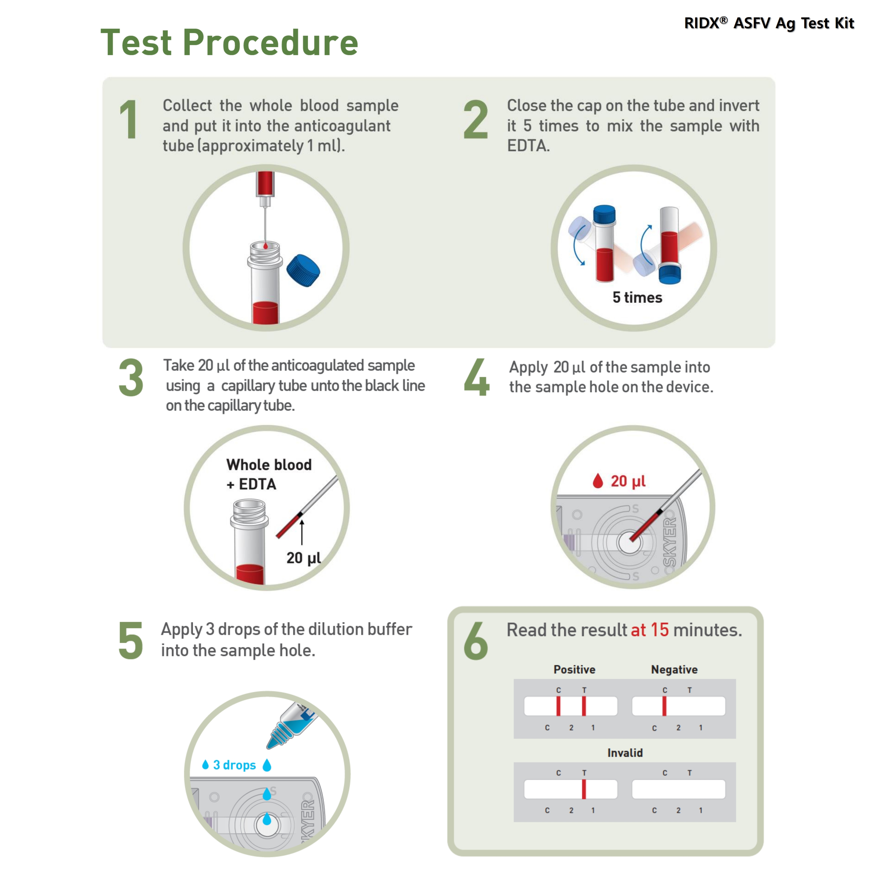 The RIDX® ASFV Ag Test Kit is a lateral flow chromatographic immunoassay for the qualitative detection of African swine fever virus (ASFV) antigen in porcine blood. This kit shows two letters which are the test (T) line and the control (C) line on the surface of the device. If the ASFV antigen exists in the sample, it binds to the gold-conjugated anti-ASFV antibody. The antigen-antibody complex moves through the membrane by capillary force and responds to the secondary anti-ASFV antibody on the test line, resulting in a red line. The control line indicates that the test is performed correctly and should appear when the test is complete.