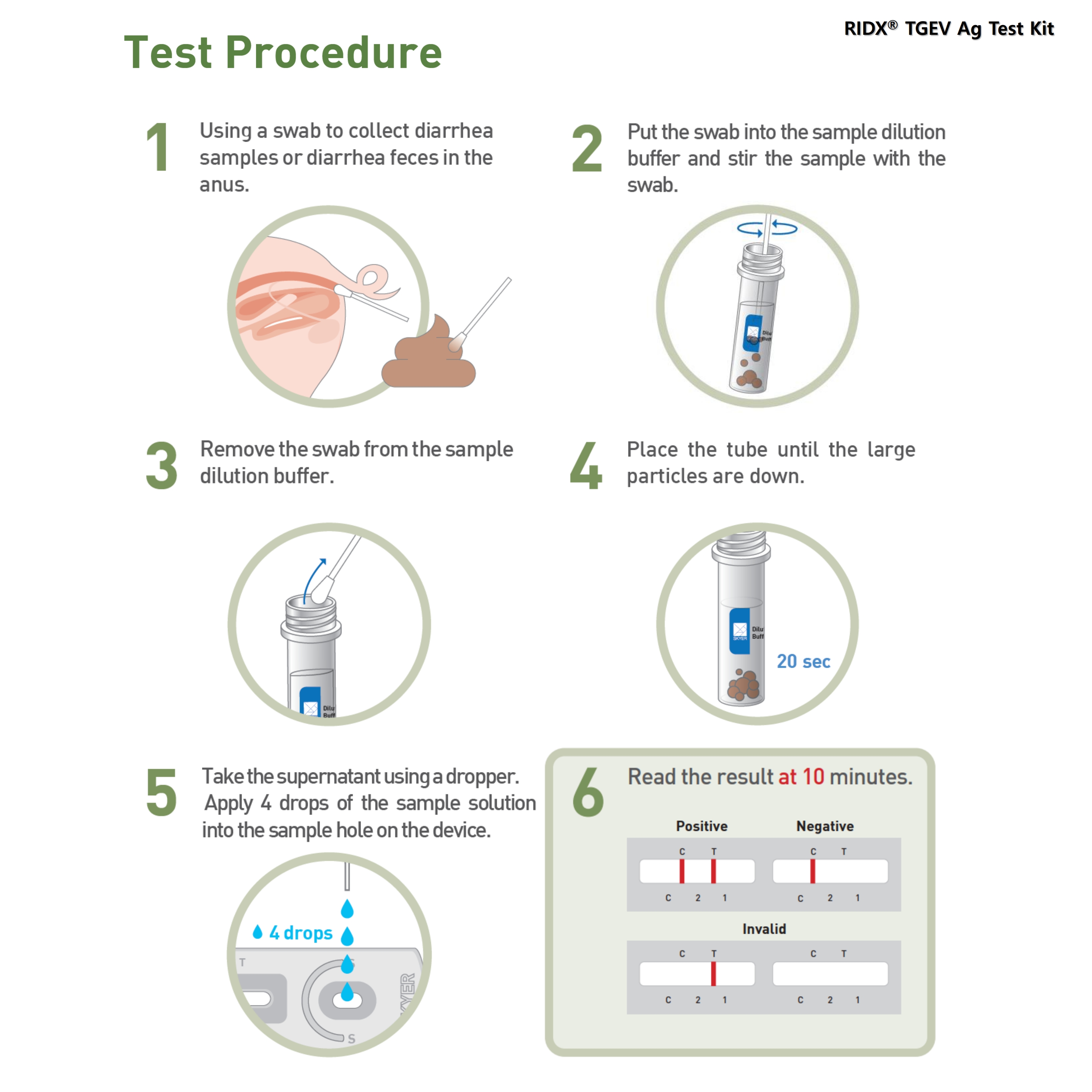 The highly selective and sensitive two monoclonal antibodies to TGEV are used as capture and detector in the kit. The RIDX® TGEV Ag Test Kit can detect TGEV antigens in porcine feces with high accuracy.